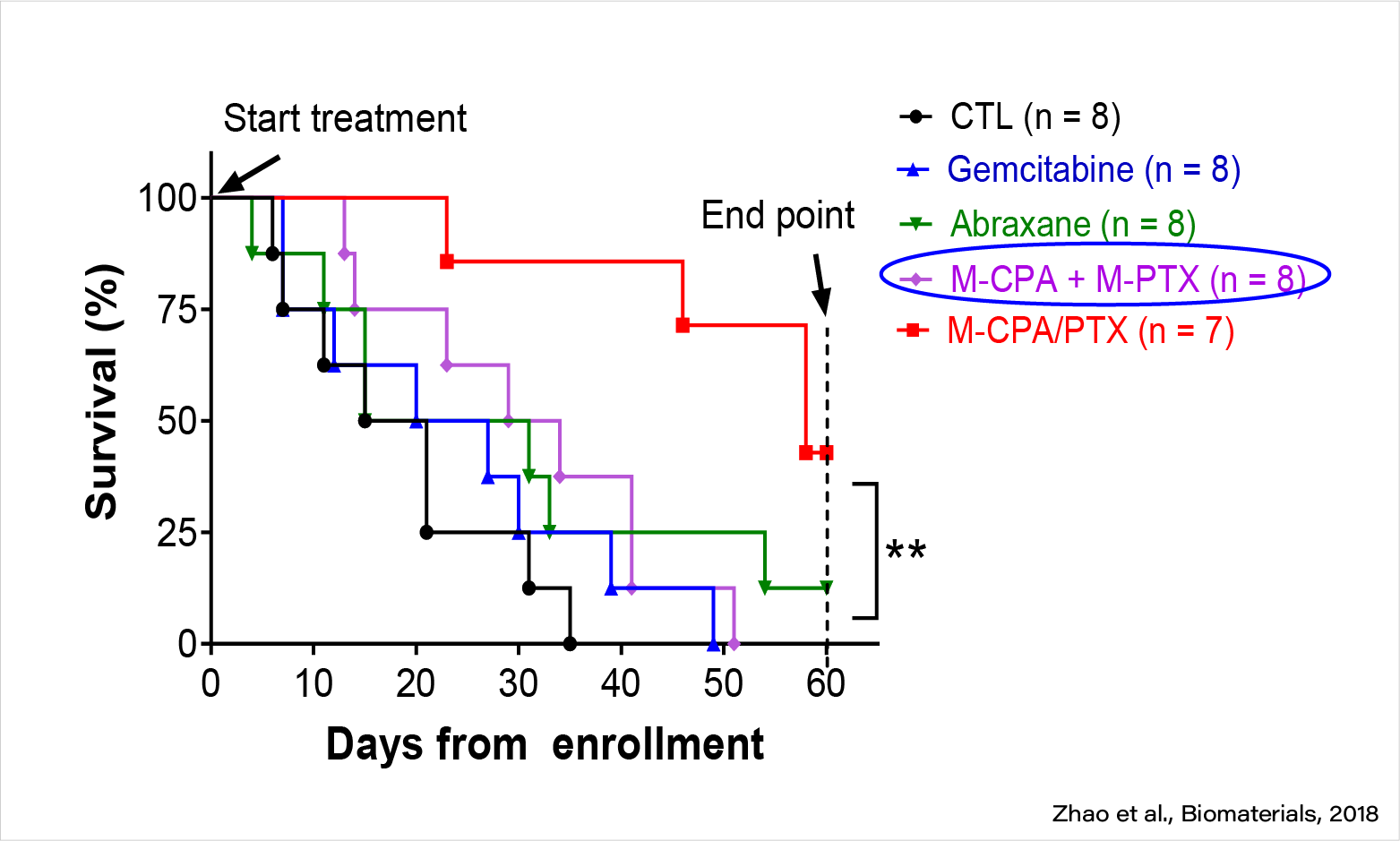M-CPA/PTX is highly efficacious against PDAC in KPC mice (late treatment).