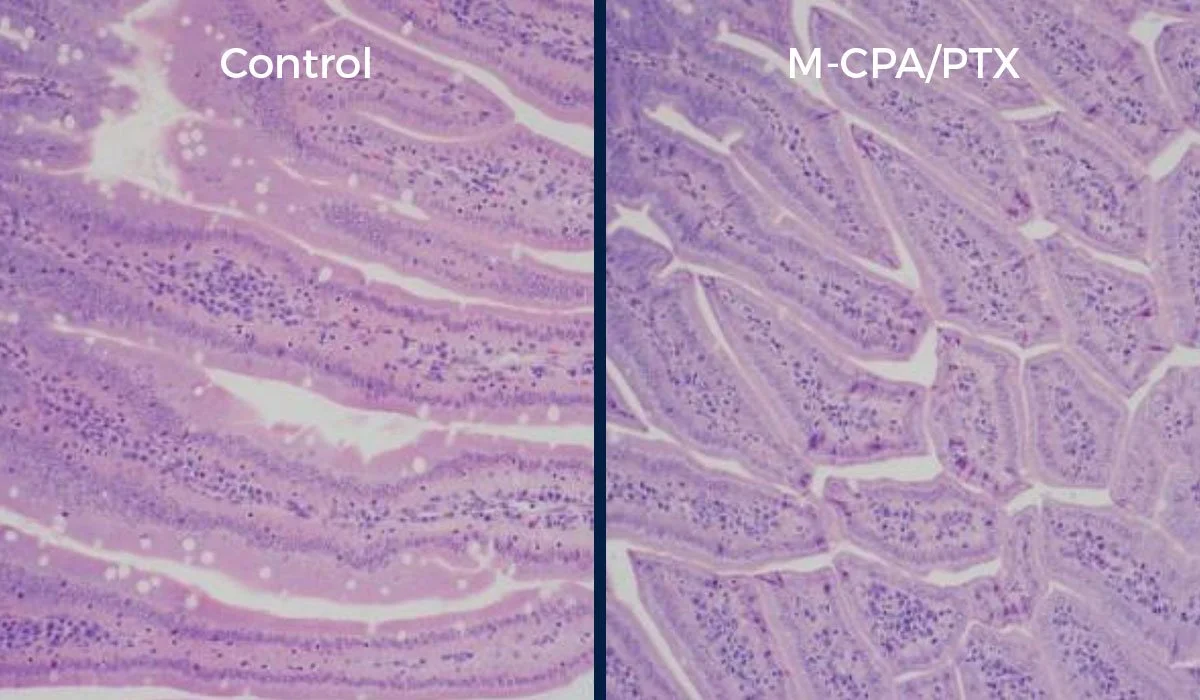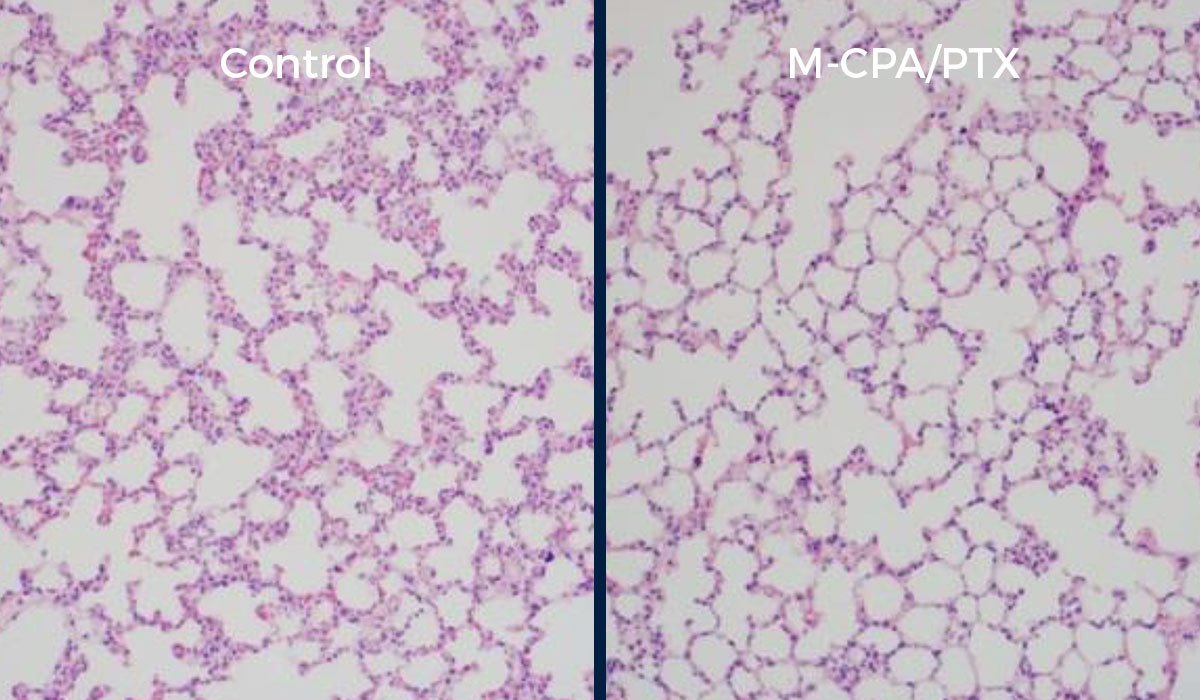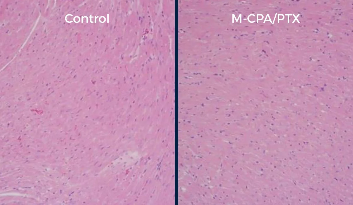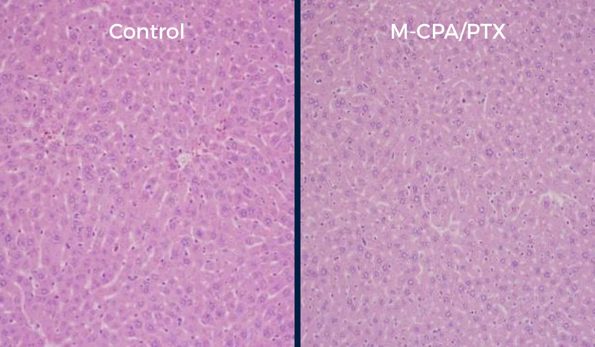 M-CPA/PTX was well tolerated in recent research. The images below demonstrate minimal difference in the comparison between the mice control group and the group treated with the combination therapy.